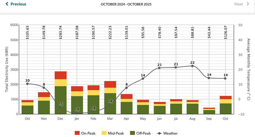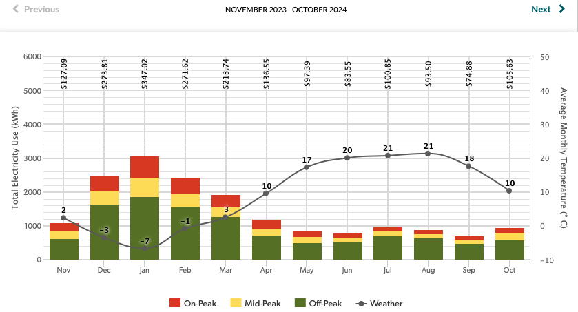 Assuming $.75/L for propane the average/year is now closer to 500 X $.75 = $375/year versus 3500 X $.75 = $2625/year. A similar electricity chart is not available for previous years but you will see that the amounts of electricity used in the cold of winter is not bizarre. Please note that last year the heat pump needed warranty work last January and so the year previous is likely more reflective of the regular cost.